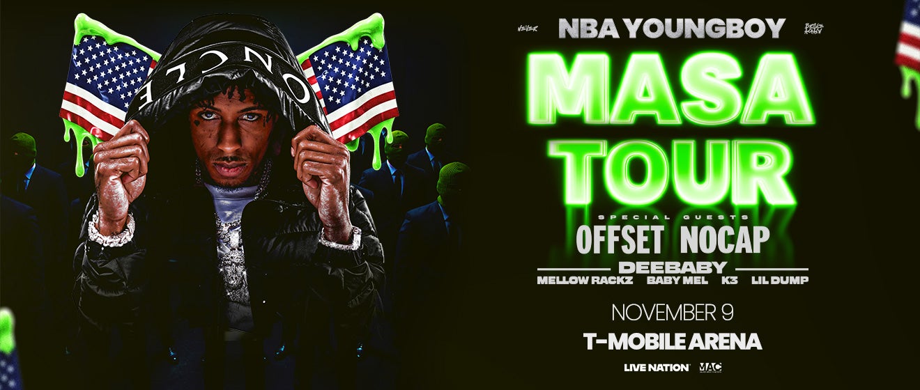 Billboard-charting rapper NBA YoungBoy brings his highly anticipated 2025 MASA TOUR to T-Mobile Arena on Sunday, November 9, marking his long-awaited return to the stage with special guests Offset, NoCap, DeeBaby, Mellow Rackz, Baby Mel, Lil Dump, k3!