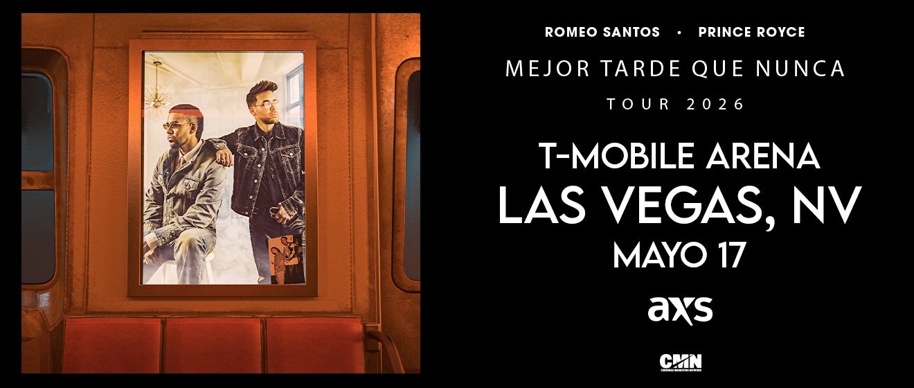 Don't miss Romeo Santos & Prince Royce – Mejor Tarde Que Nunca Tour 2026 at T-Mobile Arena on Sunday, May 17!